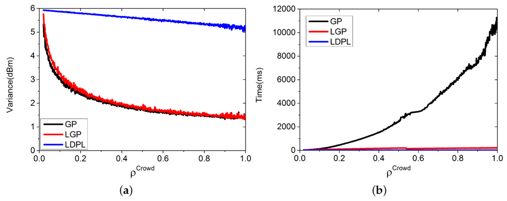 From Table 1, we can see that GP has the lowest variance in the target area, which is about 5.77 dBm, followed by LGP with an average of 5.88 dBm. The highest variance comes from LDPL, which is 7.43 dBm. In the surveyed area, all the three algorithms perform better than in the unsurveyed area. In all cases, GP performs the best over the three algorithms.