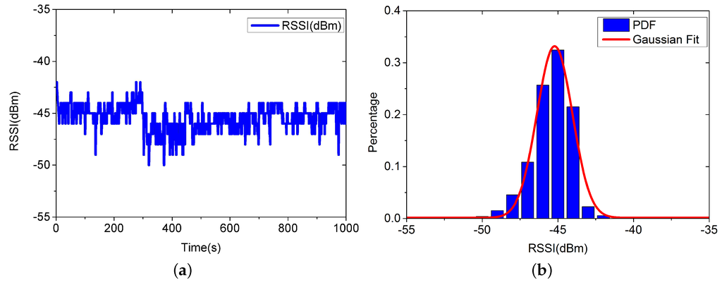 RSSI data and Gaussian Fit. (a) RSSI values measured at a stationary location; (b) PDF and Gaussian Fit.