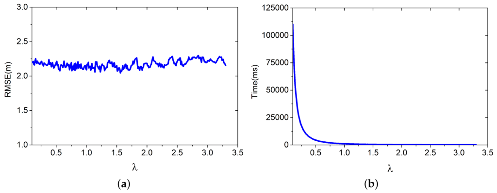 In this simulation, we build different based on different for positioning. The training database are randomly selected from , containing 80 RPs. We apply the LGP for estimating the virtual RPs’ RSS values. The improved Bayesian algorithm is applied for positioning. The other parameters are set as follows: , , , and ; λ is set to increase from 0.1 to 3.3. Results from 3000 positioning cases are shown in Figure 8.