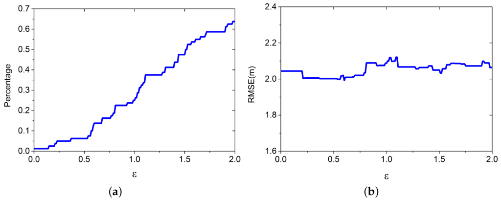 Similar with the previous setting, we apply the LGP for estimating the virtual RPs’ RSS values, and the improved Bayesian algorithm for positioning. The other parameters are set as follows: , , , and . We build based on the crowdsourcing database, which contains 80 RPs and is randomly selected from . ε is set to increase from 0 to 2. Results from 3000 positioning cases are shown in Figure 9.
