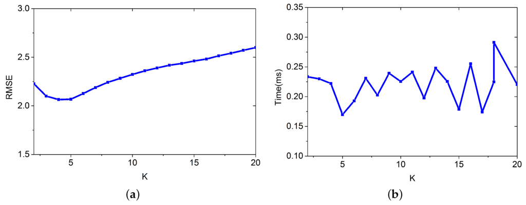 Time for positioning and RMSE vary with K. (a) RMSE; (b) Time for positioning.