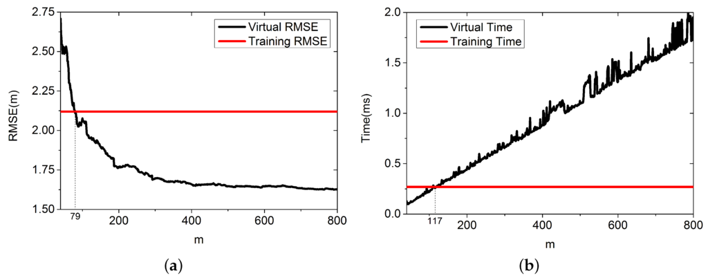 Figure 11a shows that when m is about the same as the number of training RPs, the two methods perform the same. However, as m increases, the proposed algorithm performs better. When , the RMSE is 1.63 m compared with 2.12 m using the training database. The proposed algorithm improves the accuracy by about 23.2%. Figure 11b shows that when , it performs the same as using training database, and the proposed algorithm needs more time for positioning.