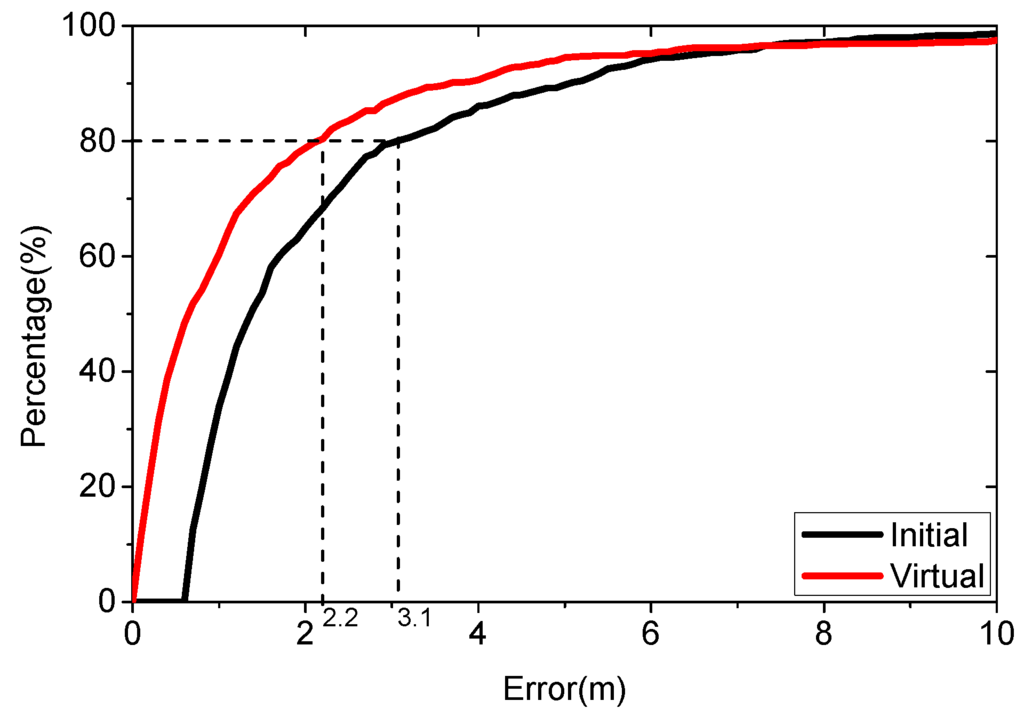 Figure 14 shows that the proposed algorithm performs better. The average localization error is 2.47 m using the initial database, while it is 1.84 m using the virtual database. The new algorithm improves the accuracy by 25.5%, with an average positioning error below 2.2 m for 80% of the cases, while the virtual database is 3.1 m.