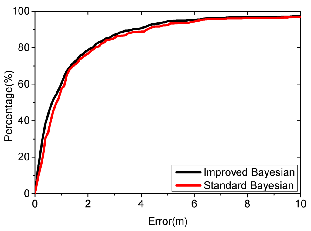 We make comparison to the standard Bayesian algorithm. Both the new algorithm and the standard algorithm apply the virtual database for positioning. The parameters are set as follows: , , , . The density of the virtual database is 1. Figure 15 shows the results from 3000 positioning cases.