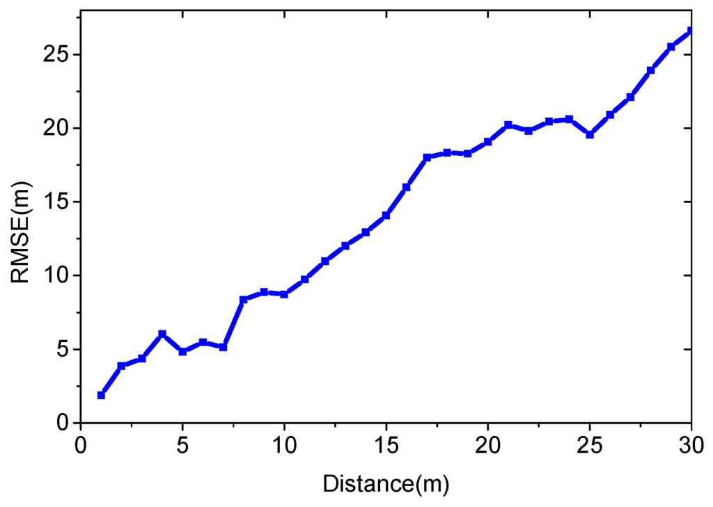 Figure 16 illustrates that the RMSE increases as the distance to the surveyed area grows. If the users are less than 10 m away from the surveyed area, the average positioning error is 5.75 m. This positioning result is not accurate enough, but sometimes it is useful, especially for areas without site survey.
