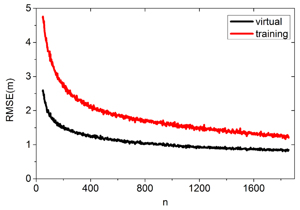 We first estimate the user’s coordinate using virtual database and training database in the surveyed areas. The parameters are set as follows: , , , . The density of the virtual database is 1. Figure 14 shows the results from 3000 positioning cases.