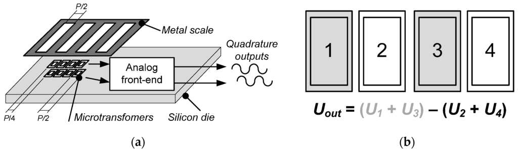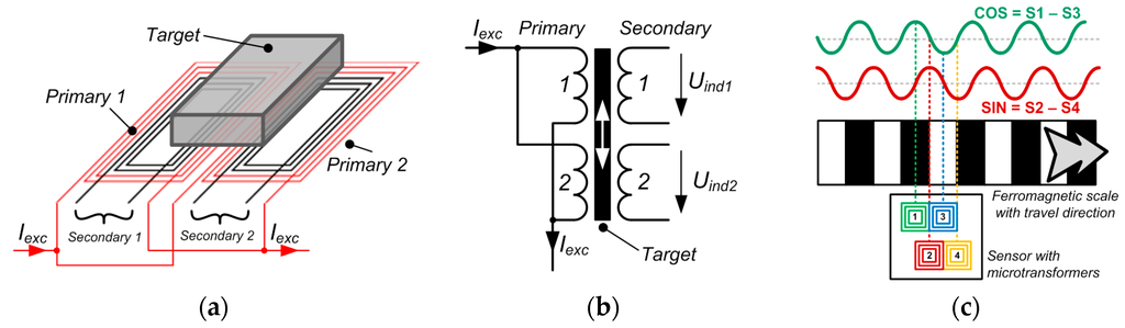 When the full half-period of the ferromagnetic scale is positioned centrally over the first microtransformer, the coupling between the primary and the secondary winding is strongest for this microtransformer. Conversely, the coupling is weakest for the third microtransformer as the void half-period is positioned over it. In this situation, the voltage difference of the microtransformer pair is maximal. In the same position, the second and fourth microtransformer have equal outputs as they are set to cover equal areas of full and void half-periods. Therefore, their differential signal is zero. The outputs change periodically if the target moves, returning the sine and the cosine differential quadrature signals given by the equations in Figure 1c. Again, the signals would be inverted for a conductive non-ferromagnetic scale.