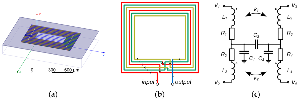 (a) The 3D model of a single microtransformer introduced into the parasitic extraction software; (b) The winding structure used in the microtransformers. Layer thicknesses and color coding are given in Figure 4a; (c) The model circuit of a single microtransformer. The components’ values are given in Table 1.