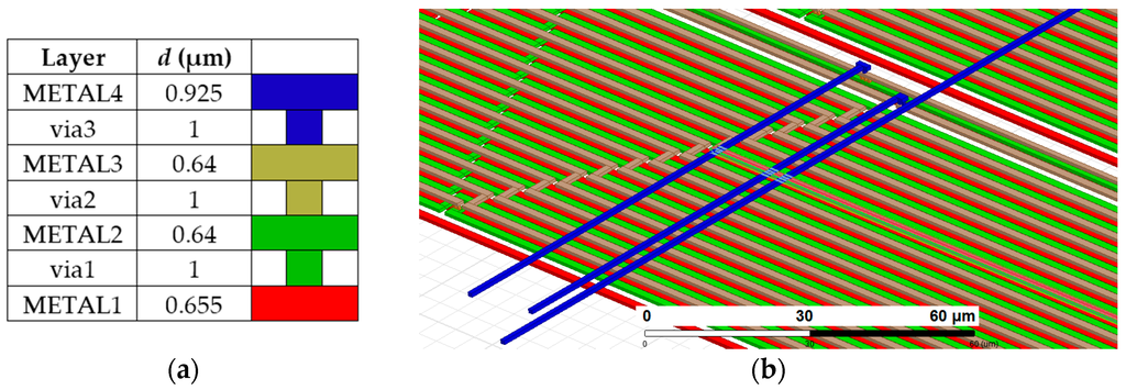 A 3D model of the microtransformer is presented in Figure 3a and Figure 4b. Both the primary and the secondary winding comprise 45 windings in three metal layers (15 per layer) with the bridging interconnections realized in the fourth metal layer. A standard 350 nm microtechnologic process is used. The winding trace width is 1.5 µm and the spacing between the traces is 0.2 µm. The structure of the layered winding is presented in Figure 3b. Only one winding (primary) is shown with two turns per layer to clearly illustrate the principle. The current flow direction is indicated with arrows. The secondary winding with the same structure is placed concentrically in the middle of the primary winding. The inter-winding capacitance is reduced by placing neighboring windings in different heights. This is believed to bring an approximate 60% reduction of the inter-winding capacitance (simulated using FEM as the ratio between the capacitance of two parallel rectangular conductors with trace dimensions, placed in the same and in another metal layer).The trace width was chosen according to process specification of recommended maximum current per metal trace width (1 mA/µm), to allow the nominal excitation current of 1 mA. The trace was widened to 1.5 µm as a safety measure to prevent the heating of the ASIC, which would affect the operation of the electronics. A rectangular coil shape was selected to maximize the silicon space utilization. The turn number was mainly directed by the target primary resistance range of 5 kΩ: the excitation voltage amplitude limit is limited to 5 V, which gives a nominal current of 1 mA at that resistance. This voltage limit is equal to the ASIC supply voltage and has to be followed due to the requirements of the IC ESD protection structures. The turn count also governs the windings’ inductance and their coupling factor k, which is maximized by positioning the windings concentrically.