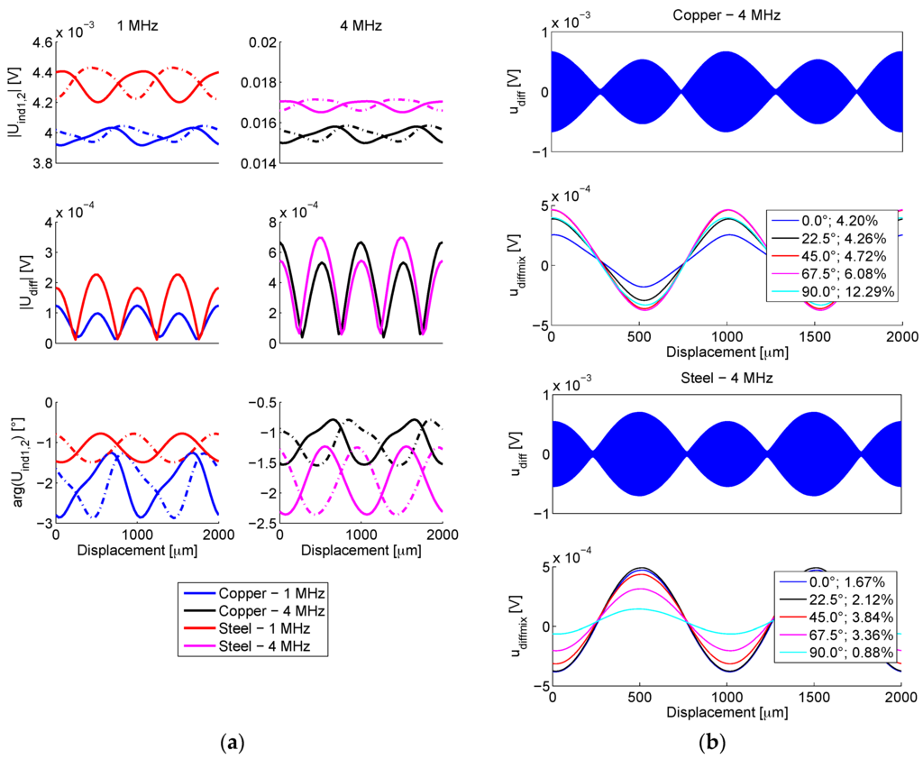 The amplitude of the differential signal (Udiff = Uind1 − Uind2) are also shown. Note that the simulated signals’ phases do not exhibit a 90° inductive shift, since the secondary signals originate in line current, which does not have an inductive character. The described inverse operation for the ferromagnetic and the conductive target scale is clearly visible in Figure 8a: magnitudes of displacement-dependent induced voltages |Uind1,2| for the copper scale are always lower due to an increased eddy-current induced energy caused by larger copper conductivity. Furthermore, the maxima and the minima of voltages |Uind1,2| oppose each other for the two materials. At 1 MHz excitation frequency, the ferromagnetic effect manifested in steel overcomes the eddy-current effect in copper, resulting in greater modulation (larger |Udiff|). At 4 MHz, the modulation approximately equalizes, indicating the increasing prominence of the eddy-current effects with rising frequency. As the phase modulation (arg (Uind1,2)) is related to the eddy current losses, its characteristics are not opposite for the two materials. It can be seen how the shape of the differential signal (converted to the time domain in Figure 8b) is much more sinusoidal in comparison to the direct transformer outputs’ amplitudes |Uind1,2|, indicating the importance of the differential operation of such sensors.