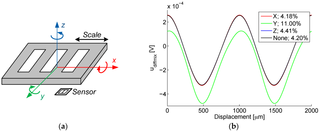 Magnetic position sensors operate by measuring the variations in spatially variable magnetic field strength. Magnetic position sensors suffer from variable offset, temperature drift, hysteresis and low immunity to noise []. As they require an external source of magnetic field for their operation, e.g., a magnetized scale, the availability, cost and environmental concerns about the production of rare-earth magnetic materials, may also present additional issues []. Since integrated optical position encoders comprise photodiodes, meaning that CMOS process modifications are required for their fabrication, the complexity and cost of optical microsensor systems are increased. Moreover, an external light source (e.g., a LED) is required [] (p. 308). Dirt, omnipresent in industrial environments, also presents a strong issue with optical encoders []. However, due to their high resolution in 1 nm range [], they are indispensable in high-precision applications.