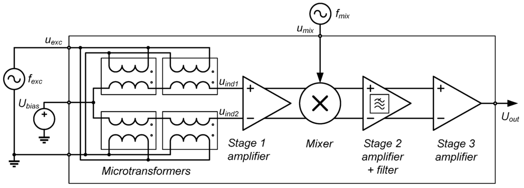 ASICs functioning as front-ends for the conditioning and the processing of the output signals of (macroscopic) inductive sensor elements are also being researched. For example, a system comprising two ASIC frontends for an inductive proximity sensor with a frequency output is reported in []. An ASIC prototype for synchronous demodulation of inductive sensor output signals is reported in [,] by Rahal and Demosthenous. A ratiometric synchronous detection front-end for eddy current sensors employing transimpedance amplifiers is reported by Nabavi et al. [,], stating that this is the most power efficient method for interfacing eddy current position sensors.