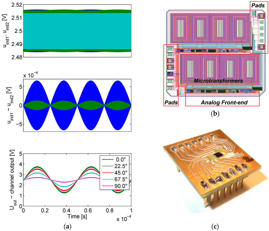 The layout of the microsystem is depicted in Figure 11b. The silicon footprint of the analog front-end is relatively small in comparison to the area of the microtransformers. The fabricated ASIC prototype on a mounting PCB is presented in Figure 11c. The ASIC silicon die dimensions are 2500 by 2200 µm, at a 300 µm wafer thickness. As the bonding wires are thin (several 10 µm), they can easily bend or tear in case of a contact with scale, which is highly possible. Therefore they must be protected. A protective epoxy coating is used for their encapsulation.