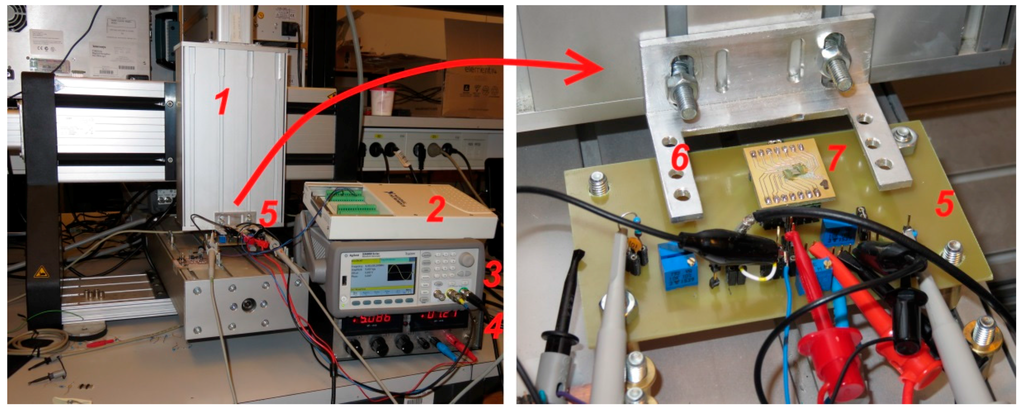The microsystem characterization setup. 1—three-axis motorized manipulator; 2—16-bit data acquisition interface (DAQ) NI USB-6251; 3—function generator Agilent 33500B; 4—DC power supply; 5—main PCB board, providing the DC bias voltages for the ASIC, and connection terminals; 6—measurement scale support (the scales (not shown, scale types presented in Figure 6) are positioned over the ASIC, supported by the forks); 7—the sensor PCB board (Figure 11c).