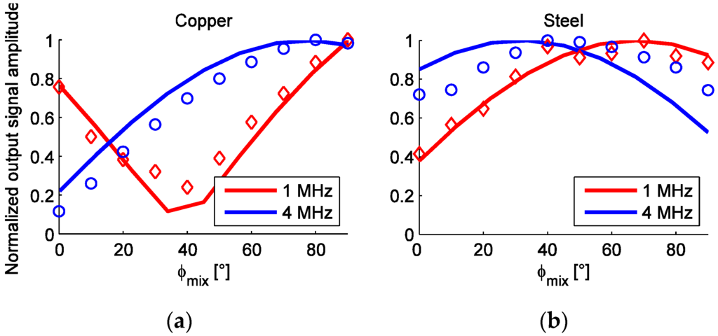 The dependence of ϕmix on the Upp1 microsystem output voltage at 1 and 4 MHz. Lines denote simulated values, while the measured points are marked by circles and diamonds. All amplitude values are normalized. (a) Results for copper scale; (b) Results for steel scale.