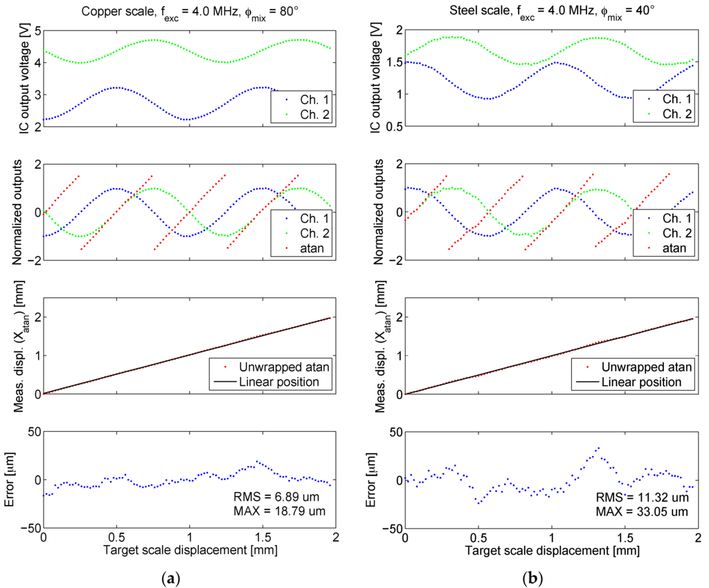 Then, the experimentally determined optimal (i.e., providing the maximal output amplitude) frequency and phase for both scales (4 MHz; 80° and 40° for copper and steel scale, respectively), were used to carry out more precise target displacement sweeps with a positioning step of 20 µm, presented in Figure 15. Periodically grated scales (see Figure 6) give periodic quadrature outputs (channels 1 and 2). The starting position was arbitrary for both scales and the measurement is incremental: the displacement is always zero at the starting position.