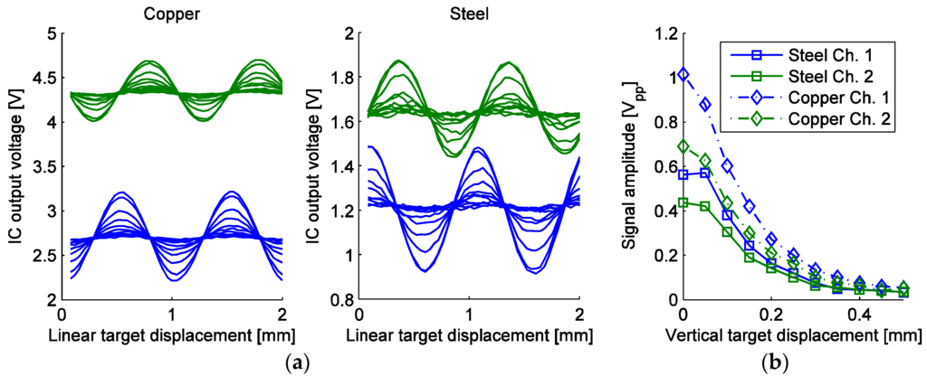 depends on many variables, namely the target material, shape, vertical displacement, as well as the ASIC input signals’ parameters: shape, amplitude and frequency of the excitation and the mixing signal, and also the phase shift between the excitation and mixing signal. Sensitivities for the optimal setup with the parameters as given in this section (results in Figure 15), are presented in Table 2. Maximal and RMS values of nonlinearity error E (Equation (5)) are also given for both scales.