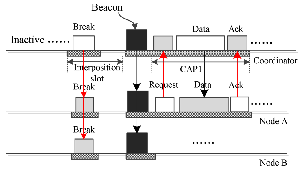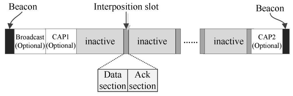Following the CAP1 period is a long inactive period into which the interposition slots are inserted. Because there is no emergency occurring for most of the time, the inactive period occupies most of the superframe. The interposition slots are shared by all of the nodes to transmit data or network commands. The effectiveness of this mechanism is based on the rarity of traffic in sleeping mode, that is there are only rare emergency events occurring between two interposition slots. Hence, even though all nodes share one interposition slot, collisions seldom happen. On occasions that collisions happen frequently, the interposition slot mechanism does not work well.