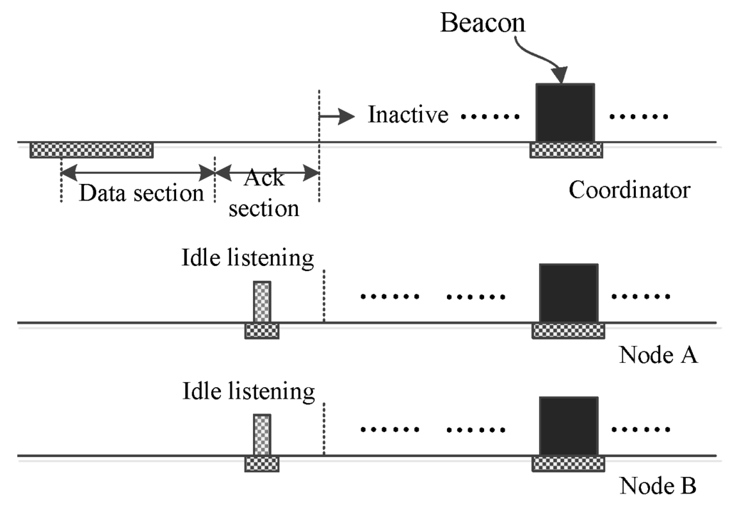 Generally speaking, a medical emergency monitoring BSN adopts a star topology structure composed of one coordinator and a small number of sensor or actuator nodes. The coordinator coordinates the communications and collects the data from the nodes. Like traditional WSNs, energy efficiency is generally the most important goal when designing or deploying BSNs. For one thing, BSN nodes, especially the implanted nodes, are severely energy-constrained, because it is inconvenient or infeasible to replace or recharge the batteries that power the nodes. At the same time, these BSNs are expected to work for a considerable length of time, e.g., several months to even several years. This makes energy management become an apparent need for severely energy-constrained nodes. Without efficient energy management, a node may run out of its energy in only a couple of days. For a sensor node, the radio is generally the part that consumes the most energy. In order to extend the lifetime of a node from days to years, many researchers have focused their attention on how to design efficient methods to reduce the energy consumed by radios. To achieve this two orders of magnitude reduction in energy consumption, the only way for a node is duty cycling its radio, that is turning on its radio only when necessary and keeping it turned off otherwise [].