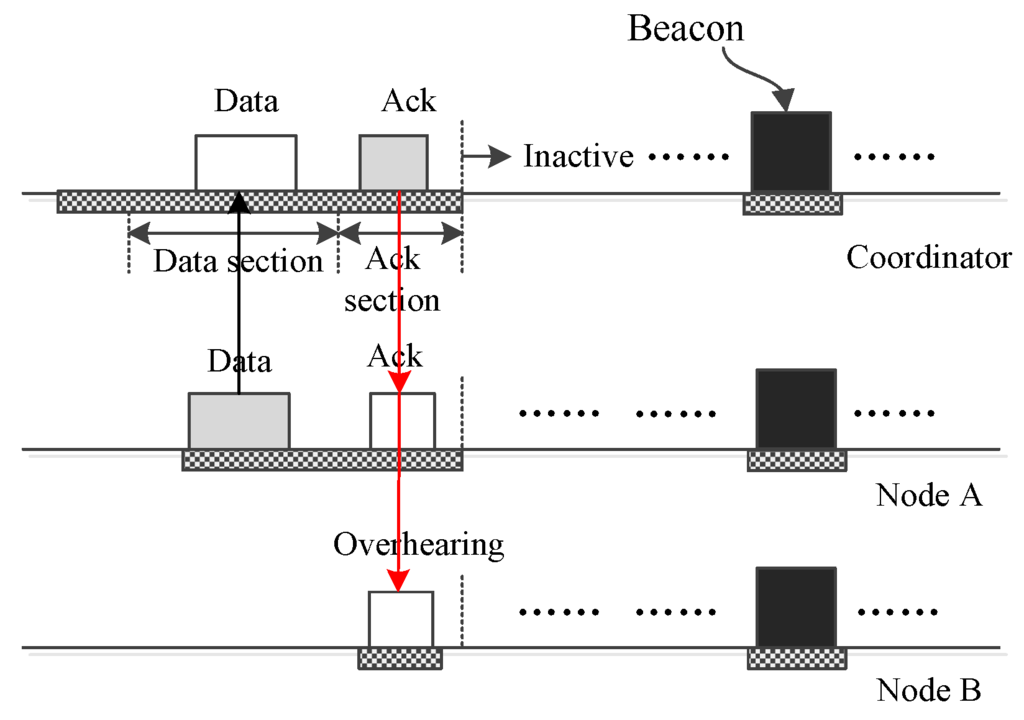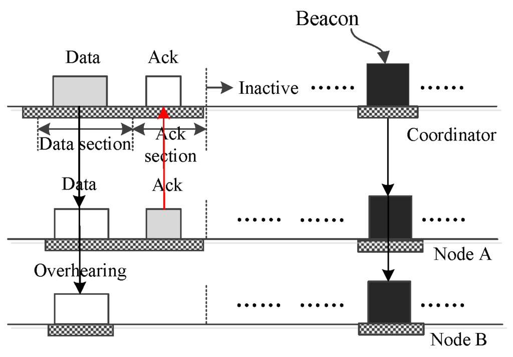 Figure 3 illustrates the operation in which the coordinator sends one small data frame to one node A. As in the figure, the data are encapsulated into a frame and sent out by the coordinator during the data section. All nodes listen to the channel to receive the frame. After the reception, only node A finds that the frame is sent to it, and other nodes, like node B, will drop the frame and shut off their antennae. In the following ack section, node A acknowledges the data frame. The operation in which the coordinator broadcasts a small data frame to all nodes is similar to the operation shown in Figure 3. The difference is there is no acknowledgment.