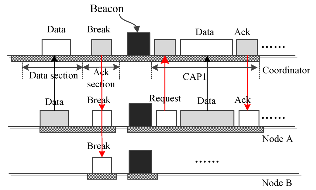 Figure 4 gives the operation in which the coordinator sends urgent big emergency data to a node A. Limited by the data frame size, big data cannot be encapsulated into an interposition data frame. To convey the big data, the coordinator needs to activate an extra period, i.e., CAP1 period. To do this, the coordinator creates a “BREAK” frame with the broadcast address and broadcasts it using the data section of a download interposition slot. This “BREAK” frame can also be transmitted using the ack section of an upload slot. This “BREAK” frame terminates the on-going superframe and starts a new one in which the coordinator activates the CAP1 period. Then, during the CAP1 period, the node retrieves the data from the coordinator.