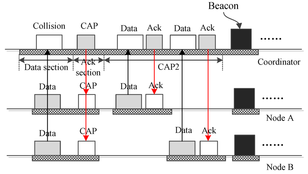 There may be two or more nodes that want to send data during one interposition slot. On such an occasion, simultaneous transmissions of these frames will lead to the occurrence of collisions. In the case shown by Figure 7, nodes A and B have data to send in the same data section. This causes a collision and two communication failures. The coordinator cannot recognize the frames, and then, it broadcasts a “CAP” frame, including a field indicating the length of the CAP period. This “CAP” frame activates a CAP2 period for the nodes to compete to transmit their data. The length of the CAP2 period is set according to the history, i.e., the data occurrence frequency calculated by the coordinator. In practice, a longer value should be set to accommodate more potential frames. If one datum is small data, then the data will be transmitted directly by the node. If one datum is big data, then a request will be transmitted. The actual transmission of the big data goes in the CAP1 period of the new superframe. After the CAP2 period, all nodes wake up to receive a new beacon frame, then begin a new superframe.