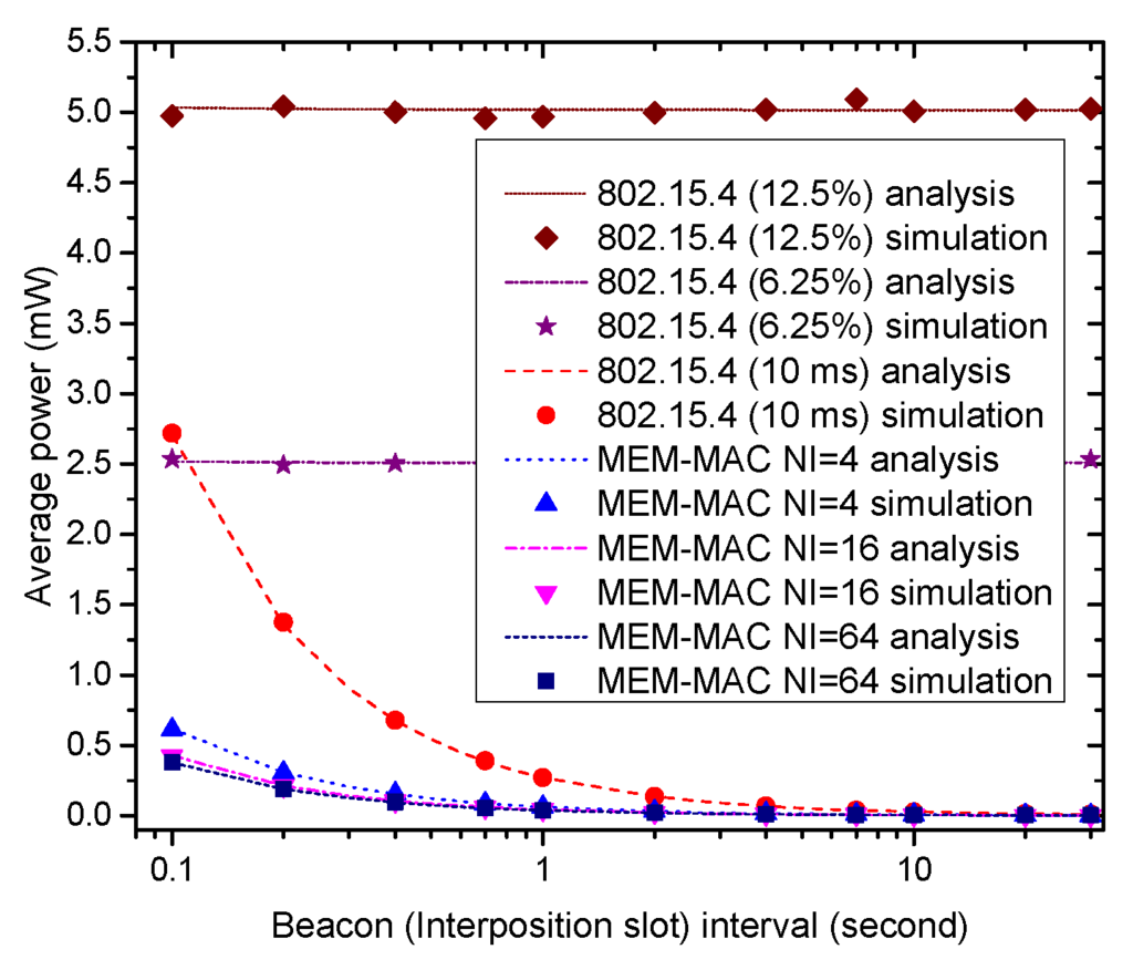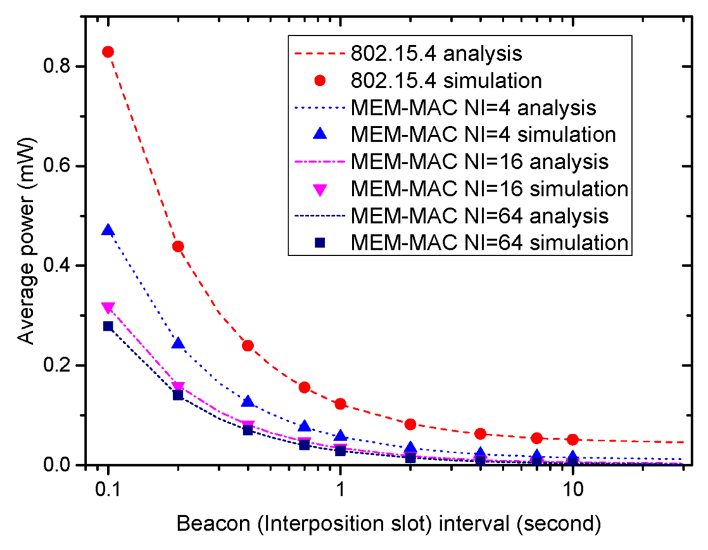 Figure 9 shows how the average power of the coordinator under different MAC schemes changes with the beacon frame interval and the interposition interval. Three different IEEE 802.15.4 schemes are used. The duty-cycles of the first two schemes are 12.5% and 6.25%, respectively. For the third scheme, the length of the active period is a constant value, i.e., 10 ms. It is easy to deduce that the duty cycle of the third scheme decreases with the beacon frame interval increase. It can be observed that the coordinator energy consumption is closely related to the duty cycle. For the first two 802.15.4 schemes, the average power keeps almost the same in terms of the beacon frame interval, because the duty cycles of the two schemes are constant. As for the third IEEE 802.15.4 scheme and three MEM-MAC schemes, the duty cycle decreases as the beacon frame interval or interposition interval increases, and this leads to the decrease of the average powers of these schemes. By eliminating unnecessary beacon frames and using short interposition intervals, three MEM-MAC schemes outscore IEEE 802.15.4 on the coordinator energy consumption.