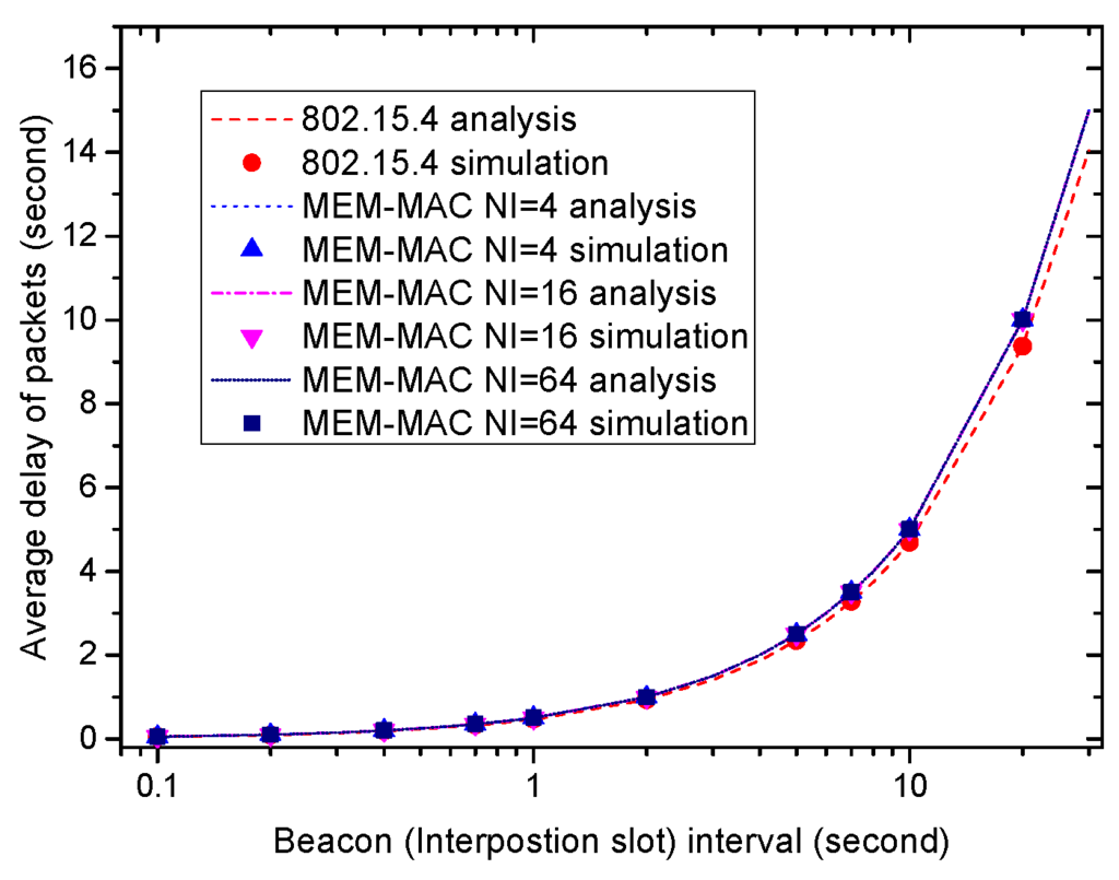 The performances of IEEE 802.15.4 and MEM-MAC are strongly related to the beacon frame interval of IEEE 802.15.4 and the interposition interval of MEM-MAC. To evaluate the effect of changing these intervals, the average emergency data occurrence interval is fixed to be a quite high value, e.g., 20 min. Such a setting can guarantee the quantity of the generated emergency data to be very little, so that it only has negligible impact on the observation of the effect of changing the intervals. All nodes are set to have the same average emergency data occurrence interval.