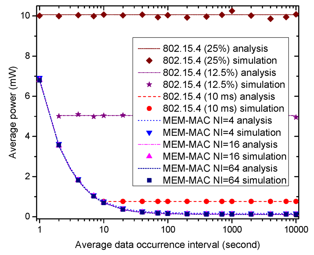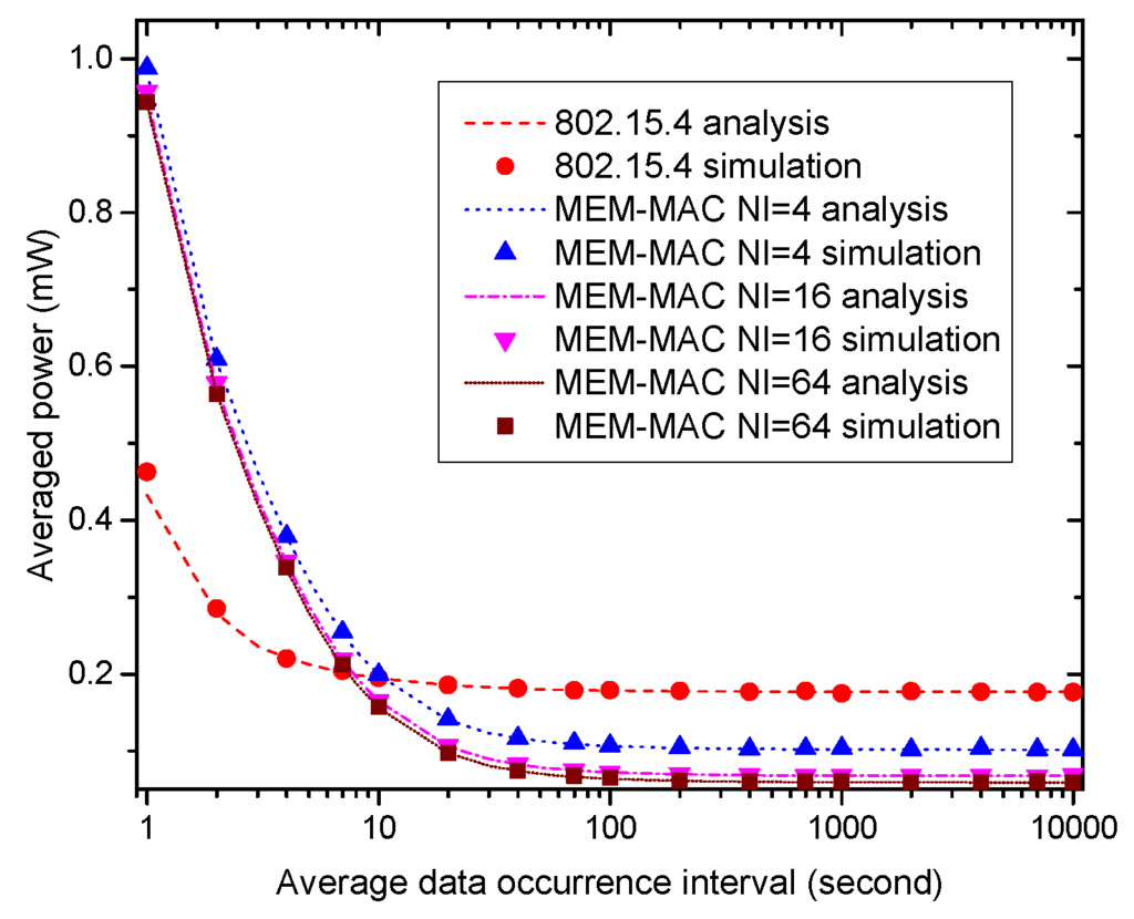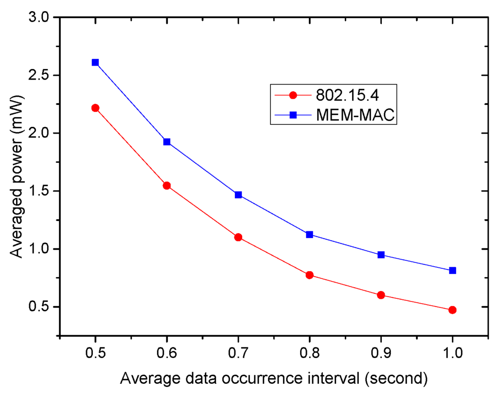 Figure 11 displays how the averaged power of a node changes with the average data occurrence interval. From the figure, the averaged powers of three MEM-MAC schemes are higher than IEEE 802.15.4 when the data occurrence interval takes a small value, and the energy consumptions of these three schemes decrease rapidly as the data occurrence interval increases. The averaged power of IEEE 802.15.4 only increases a little higher as the data occurrence interval becomes small. The energy consumptions of three MEM-MAC schemes are far higher than IEEE 802.15.4 when the data occurrence interval is small. Yet, the averaged powers of three MEM-MAC schemes quickly become lower than IEEE 802.15.4 as the data occurrence interval increases. This is because when the data occurrence interval becomes small, the emergency data frames cause frequent collisions. These collisions incur frequent CAP2 periods and superframe breaks, which result in frequent frame retransmissions and sending and receiving of extra beacon frames. These operations inevitably cause higher energy consumption.