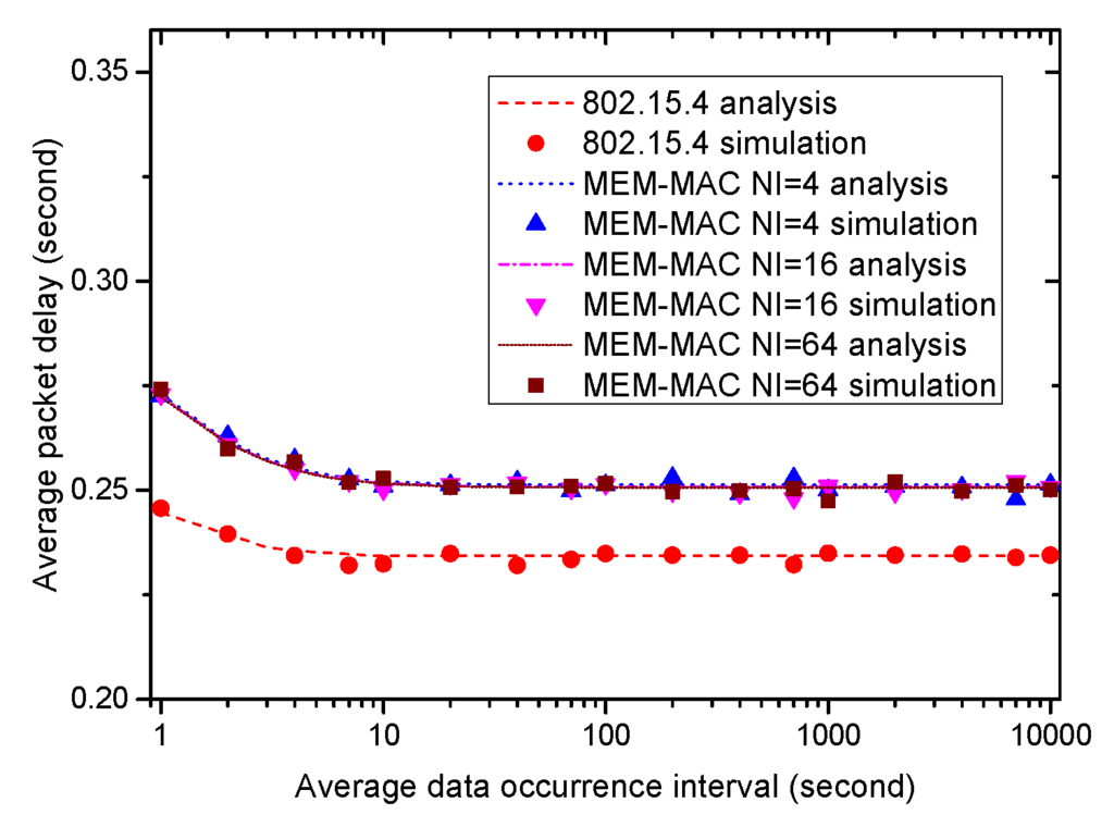 Next, we evaluate how the average frame delay changes the average data occurrence interval. The average frame delays of four MAC schemes are shown and compared in Figure 14. From the figure, all schemes can meet the time delay demand of the emergency data, which is set to be 0.3 s. For IEEE 802.15.4, except for the small increase when data occurrence interval takes small values, the average delay almost remains constant as the average data occurrence interval varies from 1 s to 10,000 s; while for MEM-MAC, the average frame delays of the three schemes all increase when the average data occurrence interval becomes small and lower to a little bigger than 0.25 s with the average data occurrence interval increases. The extra CAP periods and beacon frames are also responsible for these phenomena.
