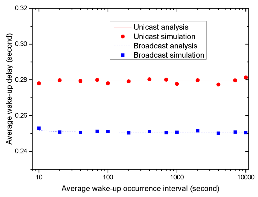 Next, we evaluate the time delay and energy efficiency performance of the wake-up mechanism of MEM-MAC. The 802.15.4 standard mentions two specifications about MAC-layer broadcast, but it does not explain what a node should do when it must broadcast a packet to all of its neighbors []. Hence, in the experiments, we use MEM-MAC itself as the baseline. We use two mechanisms, unicast and broadcast, to realize the wake-up mechanism. Using unicast, the coordinator sends a wake-up command to each node one by one using a CAP2 period, and each node replies with an acknowledgment frame. While using broadcast, the wake-up command is broadcast to all nodes, and there is no following reply. Figure 15 compares the time delays of two wake-up mechanisms as the wake-up interval increases from 10 s to 10,000 s. The delays stay rather stable as the wake-up interval varies. Additionally, the unicast takes about 30 ms more than the broadcast to wake up all nodes.