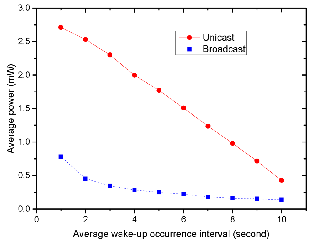 The broadcast wake-up mechanism outperforms the unicast not only in time delay, but in the energy efficiency. The energy consumption comparison of two wake-up mechanisms is shown in Figure 16. From the figure, the broadcast costs much less energy than the unicast. Although the unicast mechanism has the above disadvantages, it has one notable advantage. It can ensure that every node receives the wake-up command by the acknowledgment mechanism. However, using the broadcast mechanism, it is possible that some nodes are not woken up, because they failed to receive the broadcast wake-up command.