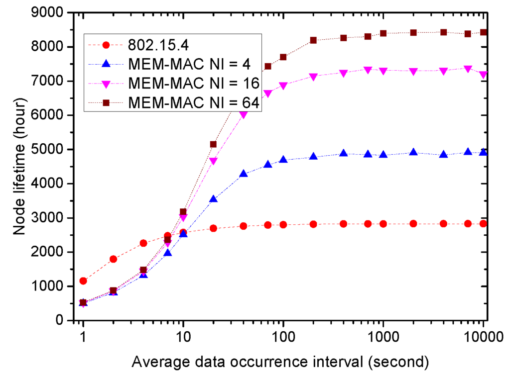 Finally, Figure 17 shows the node lifetime comparison of 802.15.4 and MEM-MAC. It is assumed that each node is equipped with one battery with a capacity of 500 mAh, and the beacon interval or interposition interval is set to be 0.5 s. When the traffic is low, it can be observed that one battery can support a node to work for 2800, 4900, 7300 and 8300 h under different MAC schemes. That is to say, a node can last 117, 204, 304 and 345 using different MAC schemes. To extend the node lifetime, the beacon interval or interposition interval should be increased to reduce the duty cycle to a lower level.