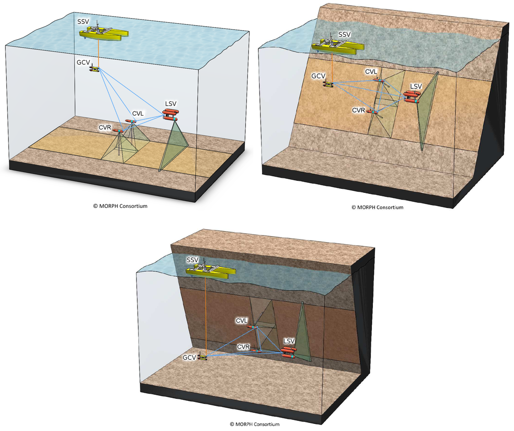 In the formation described in Morph, a leading vehicle (named the Local navigation and Sonars vehicle, LSV), carrying a multibeam sonar profiler navigates at the forefront of the formation, flying at a “safe” altitude from the seafloor and detecting possible obstacles for two other vehicles (left and right Camera Vehicles CVL and CVR) flying very close to the bottom, with a much higher risk of collision, acquiring images. The communication vehicle (called Global navigation and Communications Vehicle, GCV) is at the back with the main goal of keeping a good communication channel with the surface support vehicle (SSV). The number of vehicles and the shape of formation may change, depending on the task to perform. Additionally, the orientation of the camera on the CVx vehicles in Morph is not fixed, and thus its transformation varies depending on where the focus must be set on the observed area at each moment.