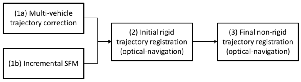 The method (corresponding to Steps 2 and 3 in Figure 2) consists of first finding an initial rigid registration between the optical-based extracted camera trajectory and optimized navigation trajectories. Then, we allow non-rigid registration between the camera and navigation trajectories by imposing, at every time instance, the optical constraints in a compact form.