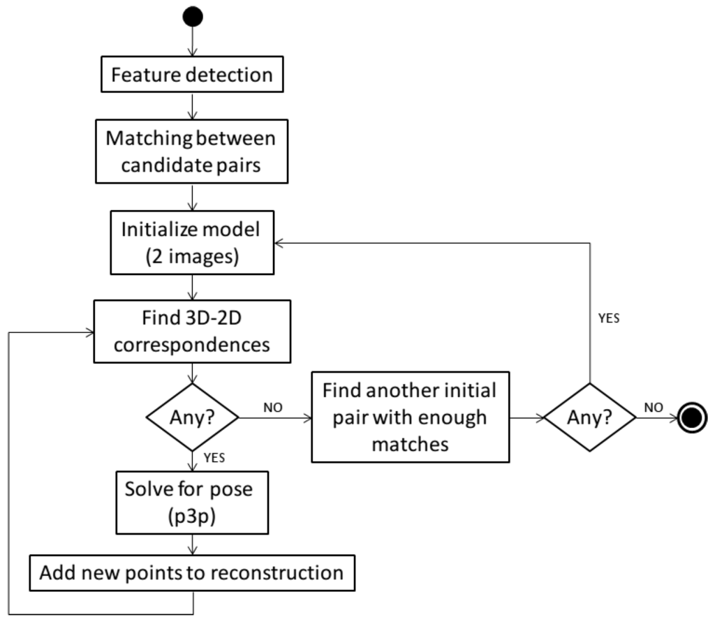 Flux diagram of the Structure-from-Motion pipeline used to construct the initial up-to-scale 3D models from optical data only. After feature detection and matching, a 2-view model is used to initialize the structure, which is then progressively updated by adding new cameras and 3D points using 3D-2D matching and resectioning.