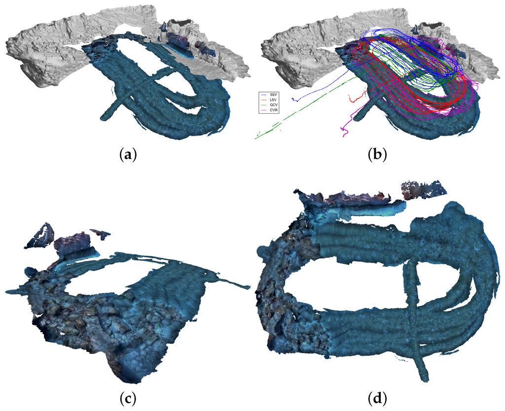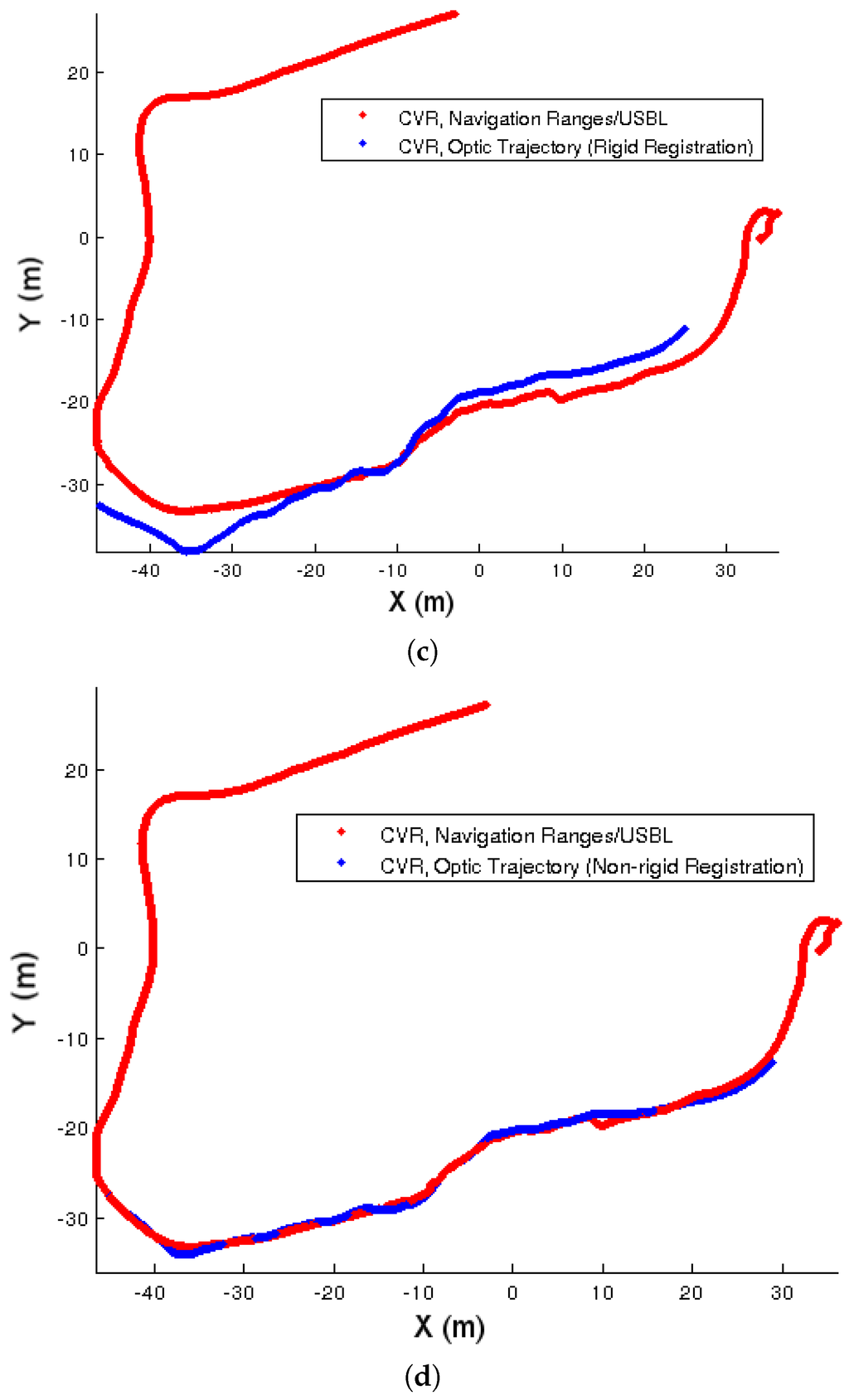 The original dead-reckoning trajectories for both LSV and GCV were in agreement, but they differed from the dead reckoning of the Sparus II AUV, which served as CVR (Figure 4a). The disagreement was due to the navigation of the CVR relying too heavily on its DVL, which was inaccurate due to the high relief of the terrain in this survey. After applying the optimization using ranges and USBL fixes, we obtained the result shown in Figure 4b, where the trajectories are now exhibiting a more realistic formation. Then, we reconstructed the observed scene and camera trajectory using SFM, to then register this last one rigidly to the obtained optimized navigation of CVR (Figure 4c). Note that the visibility was not good over all the survey, and that resulted in the optical trajectory being substantially shorter than the navigation one. Just the wall and the part that is close to it after the first turn were reconstructed. Using this vague initialization, we applied the non-rigid registering of this trajectory to resemble the optimized navigation, as shown in Figure 4d. For reference, we include in Table 1 the number of nodes and edges in the pose graph formulation for all the datasets used in this section. It is worth noticing that, while the covariances are not metrically specified, we use the same set of covariances (which act as weights) for all the experiments shown in this section. That is, we give small covariances to the absolute poses of the SSV, a little larger (but still small) to the GCV and LSV, and very large to CVL and CVR.
