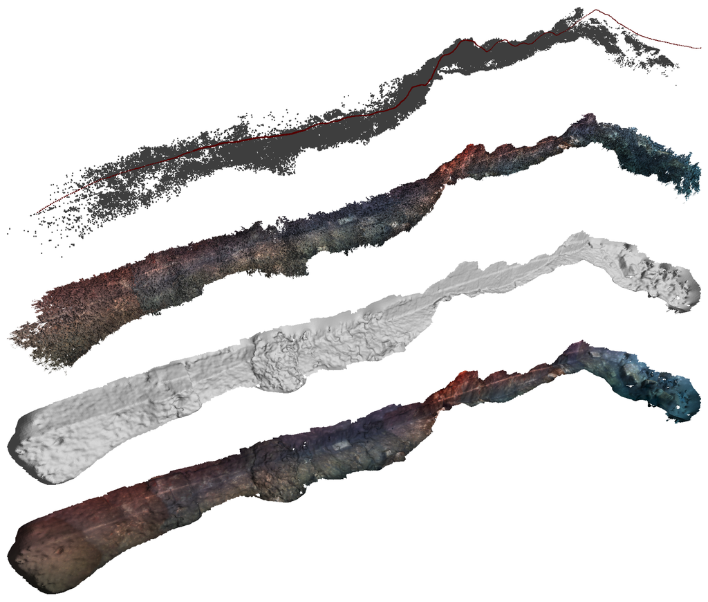 Different steps of the optical reconstruction for the Sant Feliu dataset. From top to bottom, the trajectory of the cameras in red—optimized, corresponding to that of Figure 4d—and the sparse point set resulting from the SFM process, the densified point set, the reconstructed surface and the texture mapping on this last surface.