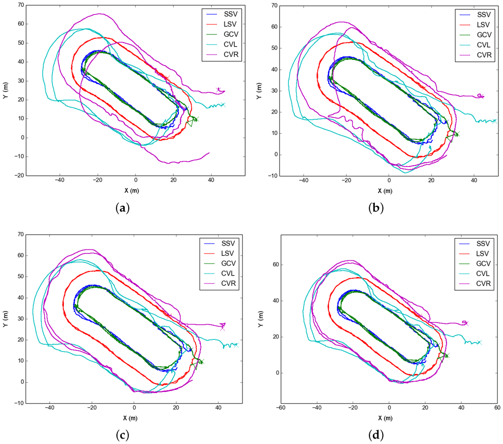 For all the above-mentioned reasons, the formation is supposed to work at control level. The trajectories of the individual vehicles are corrected on demand, based on the acoustic measures passed between the formation and basic directives. This means that each vehicle has its own dead reckoning trajectory incorporating all the navigation sensors on-board, such as the Inertial Measurement Unit (IMU), the Doppler Velocity Log (DVL), etc. The trajectories of individual vehicles are not corrected with respect to that of the other vehicles in the formation. A good example of this type of formation is that proposed by the Morph EU-FP7 project [], visible in Figure 1. In this case, the formation is not fixed, since it needs to react to the terrain and adapt to obstacles, which may include flat areas, or more complex rugged terrains. During the mission execution, all vehicles keep a desired formation with respect to the leader vehicle (LSV in Figure 1). However, after recovering the vehicles, the on-board computed trajectories stored on each robot do not resemble the formation performed in real time. Obviously, this complicates further processing to be applied on the collected data.