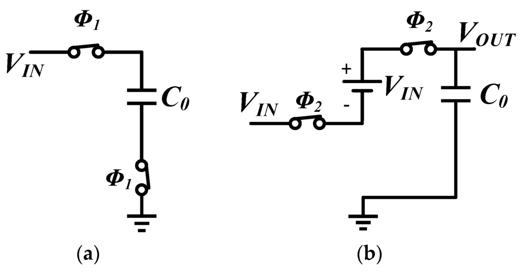 Figure 3a illustrates the schematic of the 2X Makowski charge pump. [] The non-overlapping phases and which control the switch in the Makowski charge pump are as depicted in Figure 3b. Equivalent circuits during both phases are exhibited in Figure 4.