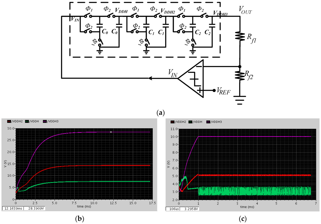Simulation results using Cadence Virtuoso are presented in Figure 6b,c. The output voltage of the output of the designed cascade charge pump can be pumped to as high as 28 V (Figure 6b), and the ripple is about 20 mV. The output of the first stage is only 7 V as the large load current is needed to drive the other stages. By using the feedback control module, the output voltage can be kept at a desired value such as 10 V (Figure 6c).