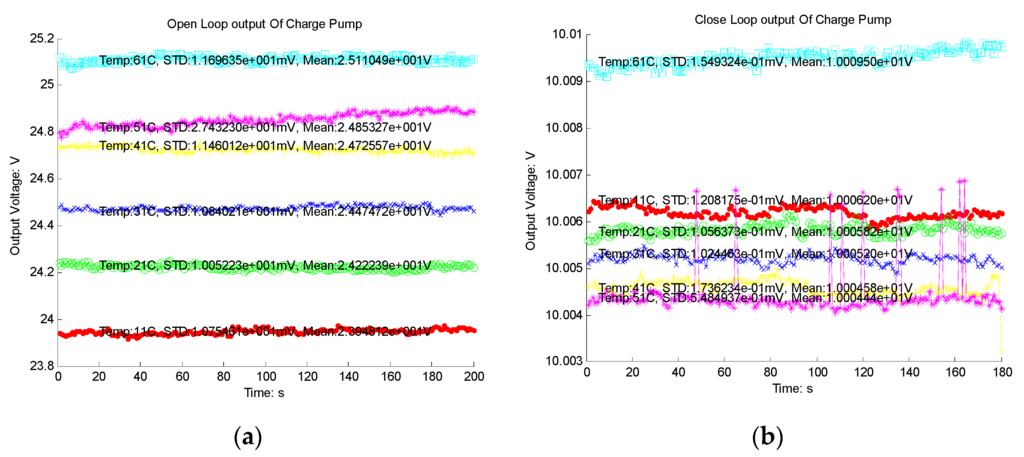 The charge pump system was designed and fabricated in a 0.35 µm HHGRACE high voltage CMOS process. Experimental results of the output of the designed cascade charge pump are presented in Figure 7a. The output voltage can be pumped to as high as 25 V, and the ripple is about 30 mV. However, the voltage value varies 4.48% when the temperature changes from 10 °C to 60 °C. By using the feedback control module, the output voltage can be kept at a desired value such as 10 V with a 0.2 mV ripple and 0.05% variation from 10 °C to 60 °C (Figure 7b). These results coincide with the simulation results very well.
