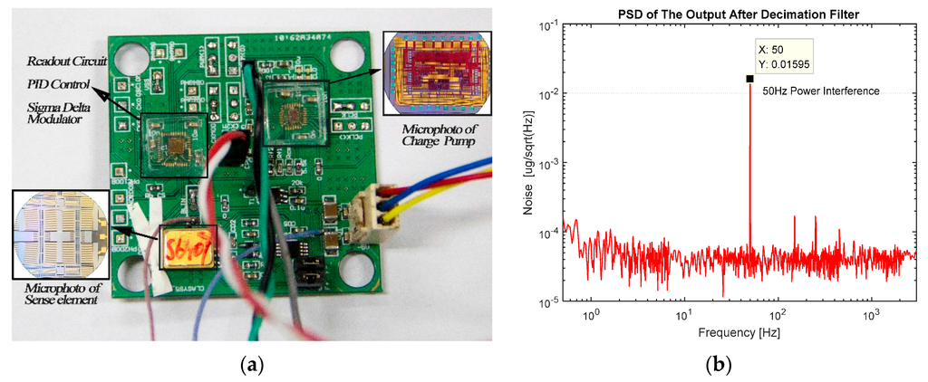 The MEMS accelerometer: (a) The laboratory prototype of MEMS accelerometer using charge pump; (b) PSD of the accelerometer’s output after decimation filter.