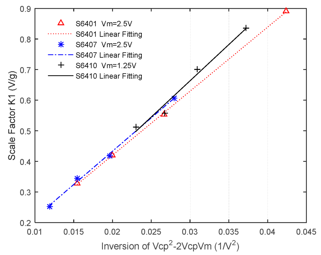 Test results (Figure 9) and their linear fitting coincide the theoretical formula very well by using MATLAB polyfit. For different accelerometers and different values of , the scale factor is always nearly proportional to the inversion of .