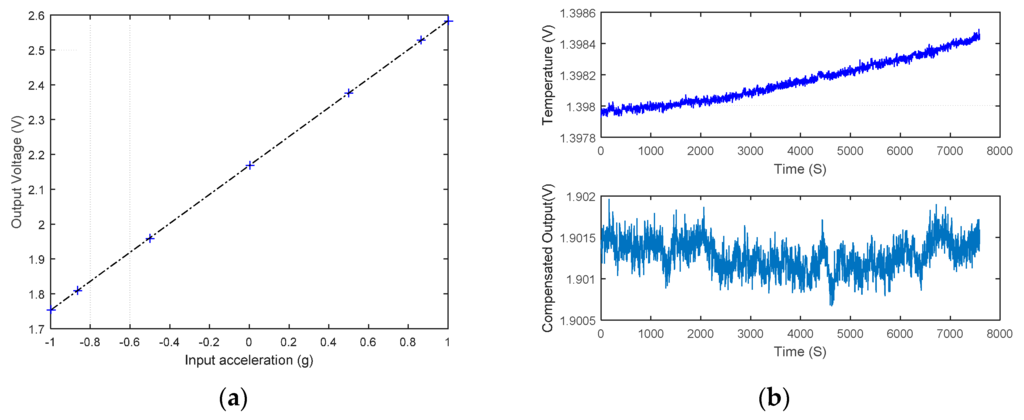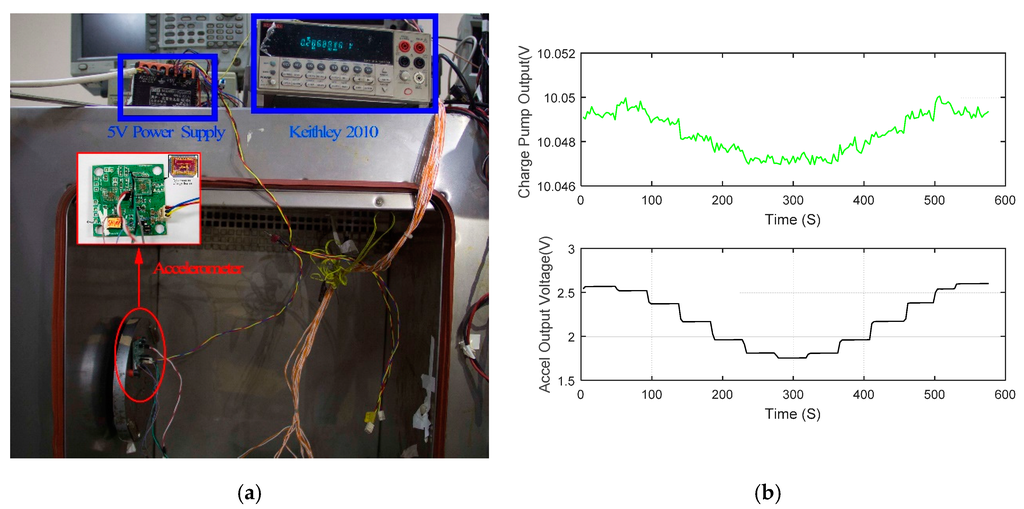 The experimental setup of the 12-point tumble test is depicted in Figure 10a. The output of the accelerometer is recorded every 30 degrees. Keitheley 2010 is used to collect data which is then saved and processed by using a computer. Twelve raw numbers acquired per rotation can be used to calculate the nonlinearity of accelerometer. As a component of the proposed accelerometer system, the output of the charge pump may change a little along with the input acceleration (see 3.1 mv Vpp of S6401 in Figure 10b). The same can be observed in other accelerometers. The dashed curve (see Figure 11a) using data from Figure 10 reveals the relation between the output of the accelerometer S6401 and the input acceleration within ±1 g. The nonlinearity of S6401 is 0.222% (when the input acceleration is −1 g). The 2 mV deviation of at −1 g contributes a nonlinearity of 0.072% (32.6% of all) as Equation (8) reveals.