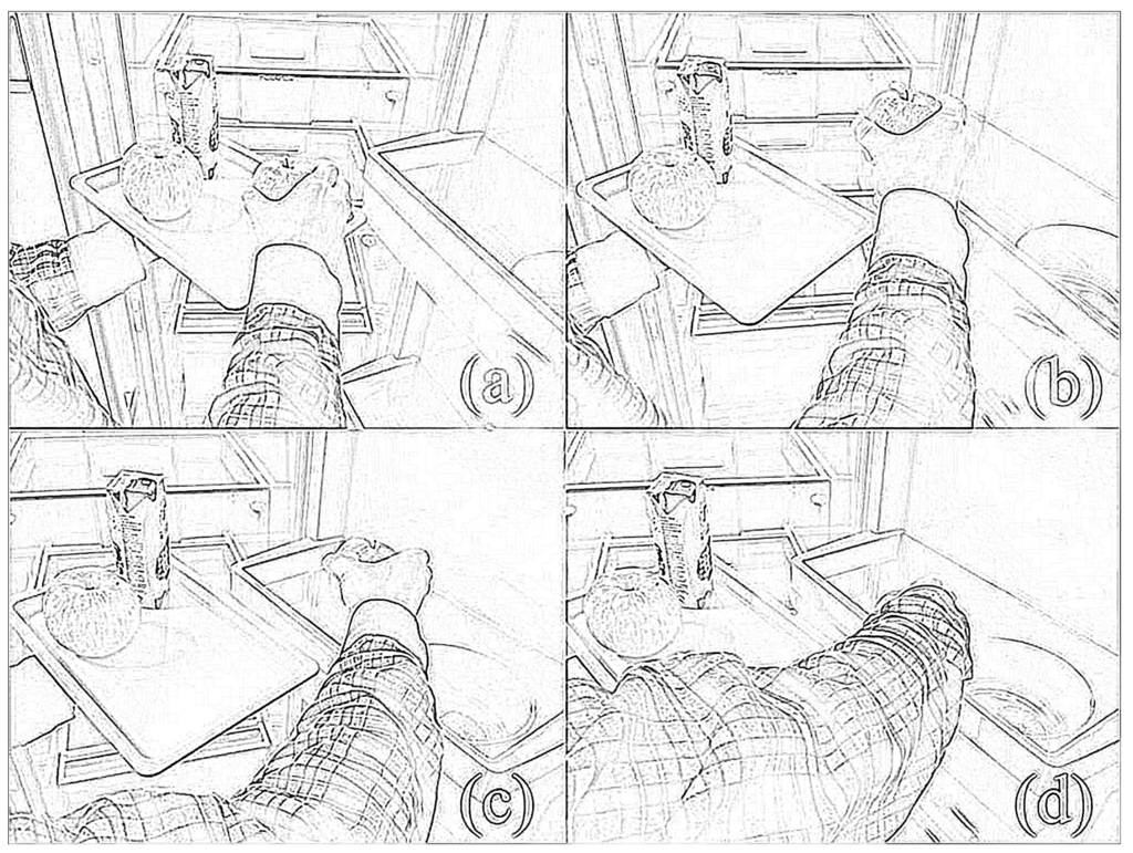 Schematic description of the steps to perform the bimanual complementary task. The left hand, assumed healthy, plays the supportive role and holds the plate. The right hand, assumed impaired, plays the dominant role and performs the task in four steps: (a) reaches for the object and holds it; (b) takes the object off the plate; (c) moves the object towards the target position; (d) places the object at the target position.