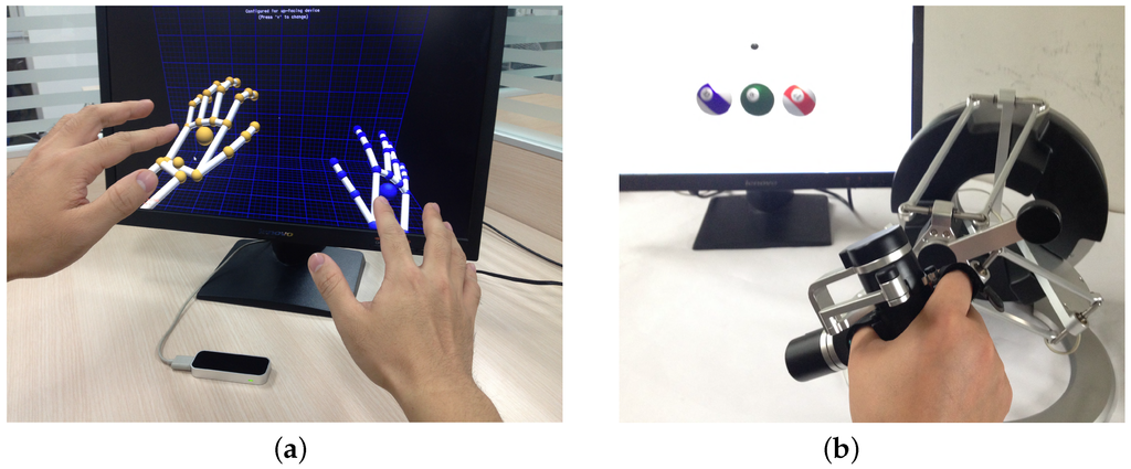 (a): the Leap Motion sensor tracks the motion of a healthy hand; (b): the omega.7 device assists the impaired hand with force feedback.