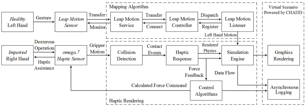 In the proposed bilateral rehabilitation system, the haptic and gesture sensors, together with the haptic rendering and visual-audio feedback algorithms, must be fused together to work synchronously and smoothly with each other, as illustrated in Figure 5.