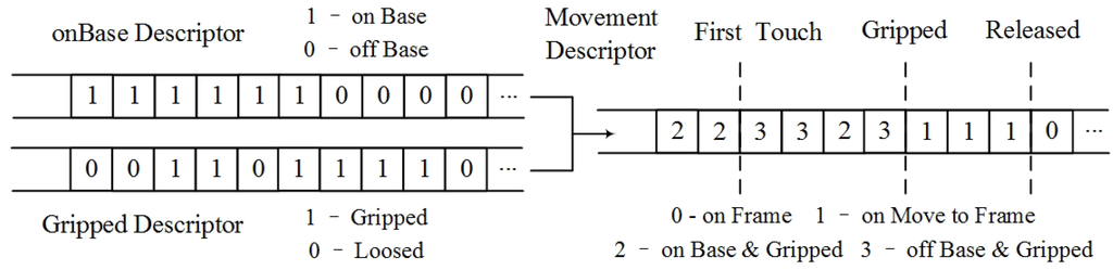 In the proposed data processing procedure, bit-vector arrays are utilized to describe the movements and status of the virtual gripper and objects. As shown in Figure 6, the descriptor dtouch (on-base descriptor) indicates whether the object is on the virtual plate, while dgrip (gripped descriptor) illustrates whether the object is gripped.