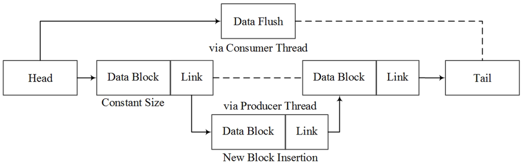 To eliminate the potential conflicts during logging, the head pointer of this hybrid data structure is exclusive to the logging (consumer) thread, and the tail pointer is accessed by the producer thread only. Based on the blocked linked list data structure, a lock-free data synchronization scheme is designed and implemented, as shown in Figure 8. The insertion function for the new data stream is callable exclusively from the producer.